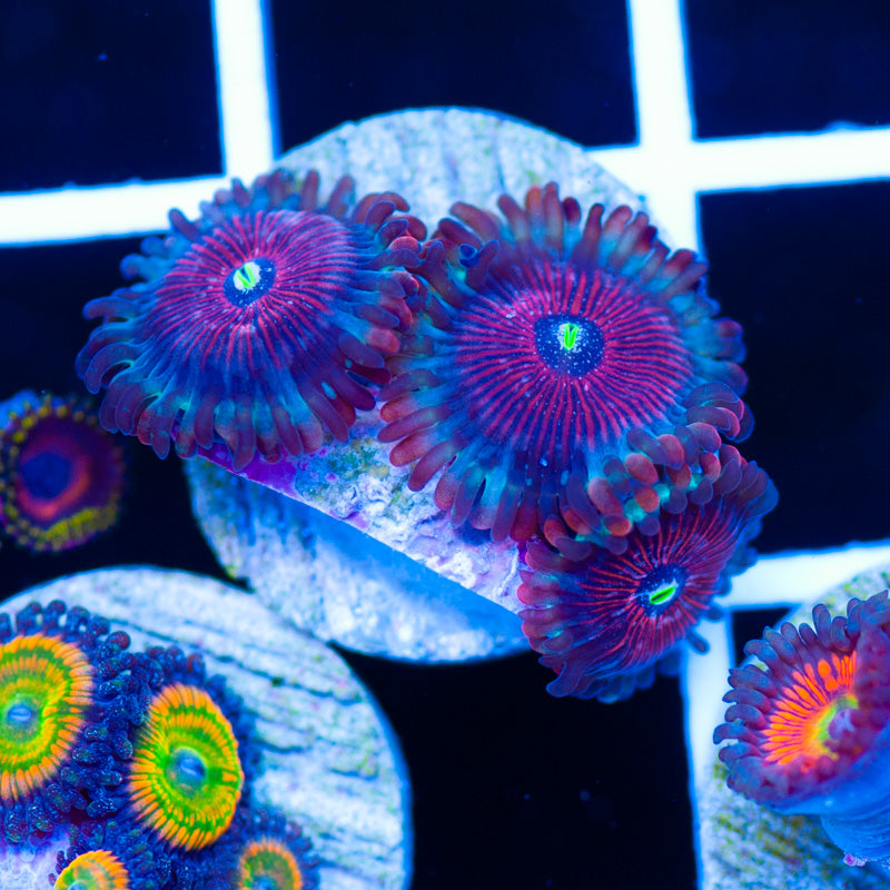 We grow our Zoanthids under ATI Blue Plus, Reef Brite blue LED’s. Nutrition is provided by Polyplab Reef Roids. We achieve the best color and polyp size by providing a system with detectable PO4, NO3, and a DKH of 8(many polyps will respond poorly to high DKH, please take that into consideration). Strong/moderate intermittent flow is very important to the health of our polyps. WYSIWYG