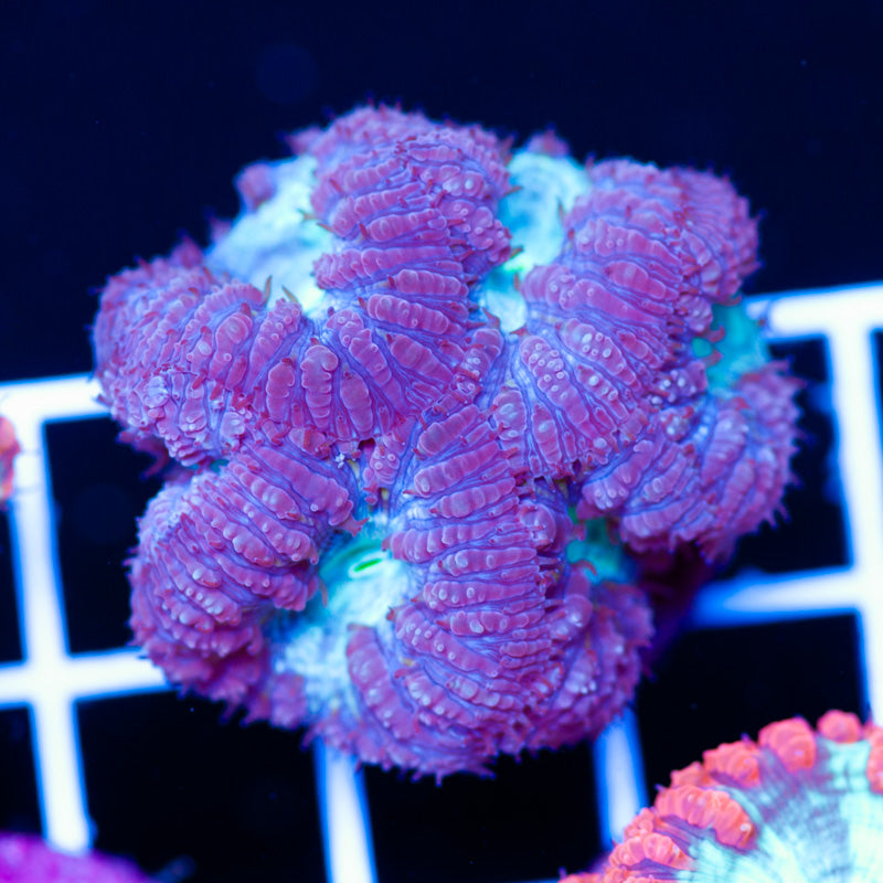 We keep our Blastomussa growing under ATI Blue Plus and Reef Brite blue LED’s, nutrition is provided by Polyplab Reef Roids and/or LRS frozen foods. Blastomussa thrive in nutrient rich environments with detectable PO4, NO3, and a DKH of 8(many corals will respond poorly to high DKH, please take that into consideration). It is our experience that most Blastomussa do best in low light(less than 75 PAR). WYSIWYG