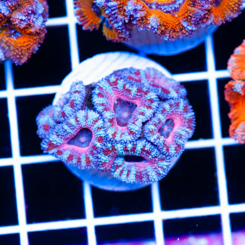 We keep our Acans/Micros growing under Reef Brite LED’s and ATI Blue Plus T5’s, nutrition is provided by Polyplab Reef Roids. Acans/Micros thrive in nutrient rich environments with detectable PO4, NO3, and a DKH of 8(many corals will respond poorly to high DKH, please take that into consideration). It is our experience that most Acans/Micros do best in low light(less than 75 PAR). Rainbow Acans can and often do change colors under different light. WYSIWYG