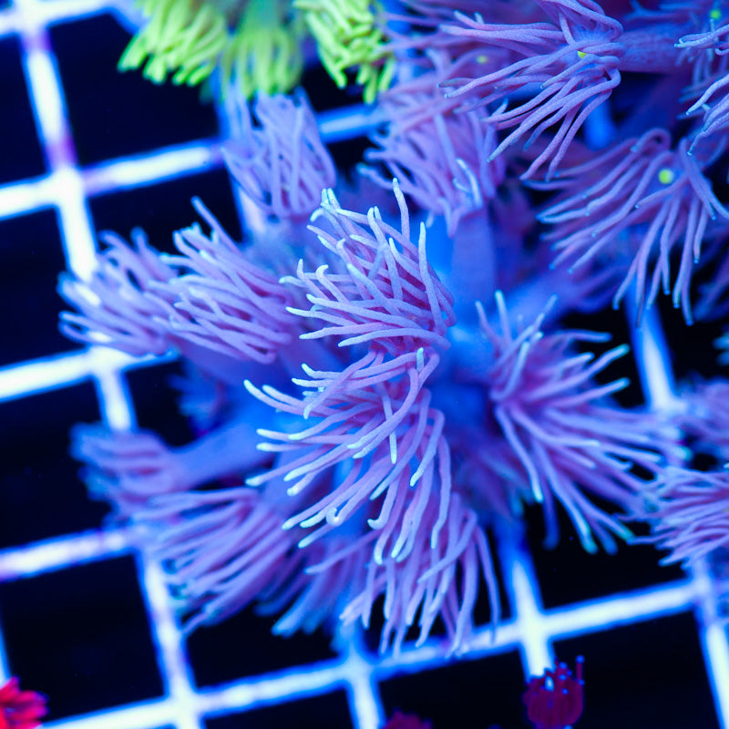 We keep our Goniopora/Alveopora growing under ATI Blue Plus and Reef Brite blue LED’s, nutrition is provided by Polyplab Reef Roids. Goniopora/Alveopora thrive in nutrient rich environments with detectable PO4, NO3, and a DKH of 8(many corals will respond poorly to high DKH, please take that into consideration). WYSIWYG