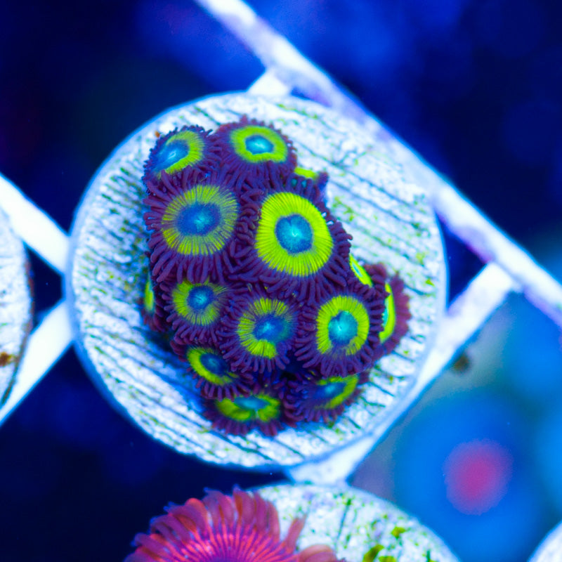 We grow our Zoanthids under ATI Blue Plus, Reef Brite blue LED’s. Nutrition is provided by Polyplab Reef Roids. We achieve the best color and polyp size by providing a system with detectable PO4, NO3, and a DKH of 8(many polyps will respond poorly to high DKH, please take that into consideration). Strong/moderate intermittent flow is very important to the health of our polyps. WYSIWYG