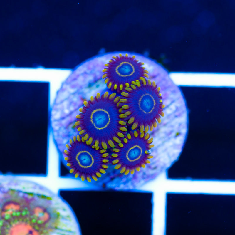 We grow our Zoanthids under ATI Blue Plus, Reef Brite blue LED’s. Nutrition is provided by Polyplab Reef Roids. We achieve the best color and polyp size by providing a system with detectable PO4, NO3, and a DKH of 8(many polyps will respond poorly to high DKH, please take that into consideration). Strong/moderate intermittent flow is very important to the health of our polyps. WYSIWYG