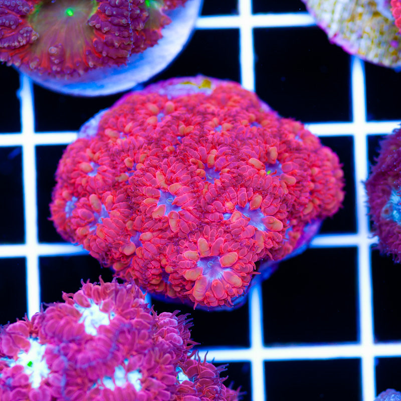 We keep our Blastomussa growing under ATI Blue Plus and Reef Brite blue LED’s, nutrition is provided by Polyplab Reef Roids and/or LRS frozen foods. Blastomussa thrive in nutrient rich environments with detectable PO4, NO3, and a DKH of 8(many corals will respond poorly to high DKH, please take that into consideration). It is our experience that most Blastomussa do best in low light(less than 75 PAR). WYSIWYG