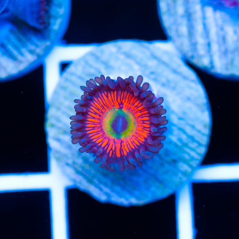 We grow our Zoanthids under ATI Blue Plus, Reef Brite blue LED’s. Nutrition is provided by Polyplab Reef Roids. We achieve the best color and polyp size by providing a system with detectable PO4, NO3, and a DKH of 8(many polyps will respond poorly to high DKH, please take that into consideration). Strong/moderate intermittent flow is very important to the health of our polyps. WYSIWYG