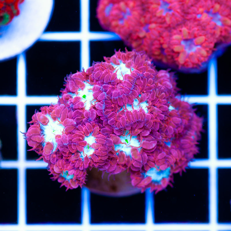 We keep our Blastomussa growing under ATI Blue Plus and Reef Brite blue LED’s, nutrition is provided by Polyplab Reef Roids and/or LRS frozen foods. Blastomussa thrive in nutrient rich environments with detectable PO4, NO3, and a DKH of 8(many corals will respond poorly to high DKH, please take that into consideration). It is our experience that most Blastomussa do best in low light(less than 75 PAR). WYSIWYG