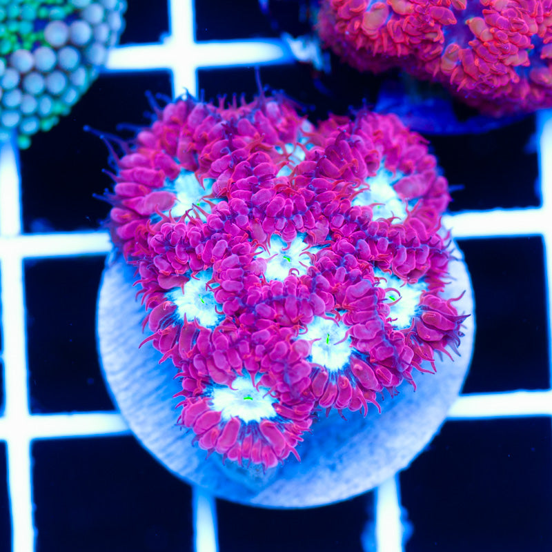 We keep our Blastomussa growing under ATI Blue Plus and Reef Brite blue LED’s, nutrition is provided by Polyplab Reef Roids and/or LRS frozen foods. Blastomussa thrive in nutrient rich environments with detectable PO4, NO3, and a DKH of 8(many corals will respond poorly to high DKH, please take that into consideration). It is our experience that most Blastomussa do best in low light(less than 75 PAR). WYSIWYG