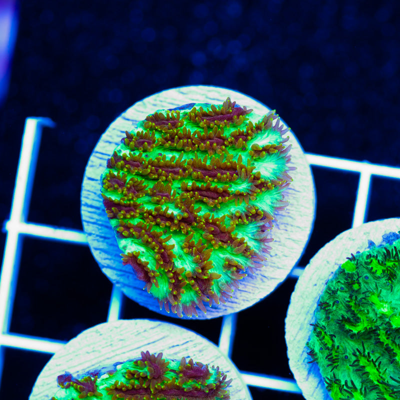 We keep our encrusting corals growing under ATI Blue Plus and Reef Brite blue LED’s in low light, nutrition is provided by Polyplab Reef Roids. Encrusting corals such as cyphastrea and leptoseris thrive in nutrient rich environments with detectable PO4, NO3, and a DKH of 8(many corals will respond poorly to high DKH, please take that into consideration). WYSIWYG
