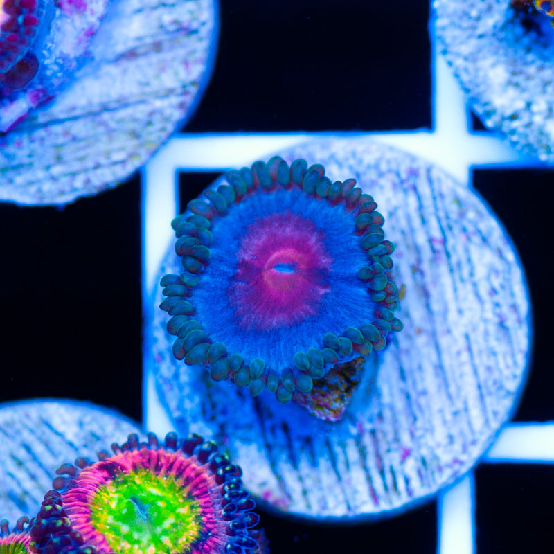 We grow our Zoanthids under ATI Blue Plus, Reef Brite blue LED’s. Nutrition is provided by Polyplab Reef Roids. We achieve the best color and polyp size by providing a system with detectable PO4, NO3, and a DKH of 8(many polyps will respond poorly to high DKH, please take that into consideration). Strong/moderate intermittent flow is very important to the health of our polyps. WYSIWYG