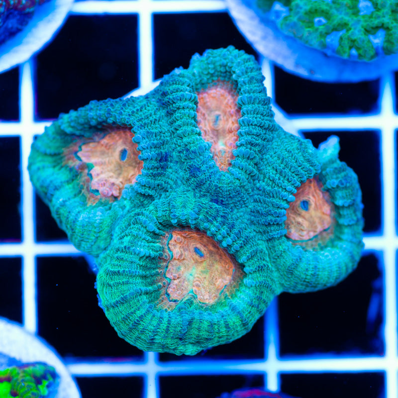 We keep our Favia/Favites growing under Ecotech Radion LED’s, nutrition is provided by Polyplab Reef Roids. Favia/Favites thrive in nutrient rich environments with detectable PO4, NO3, and a DKH of 8(many corals will respond poorly to high DKH, please take that into consideration). It is our experience that most favia/favites do best in low light(less than 75 PAR). WYSIWYG