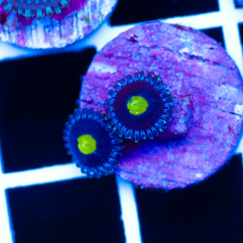 We grow our Zoanthids under ATI Blue Plus, Reef Brite blue LED’s. Nutrition is provided by Polyplab Reef Roids. We achieve the best color and polyp size by providing a system with detectable PO4, NO3, and a DKH of 8(many polyps will respond poorly to high DKH, please take that into consideration). Strong/moderate intermittent flow is very important to the health of our polyps. WYSIWYG