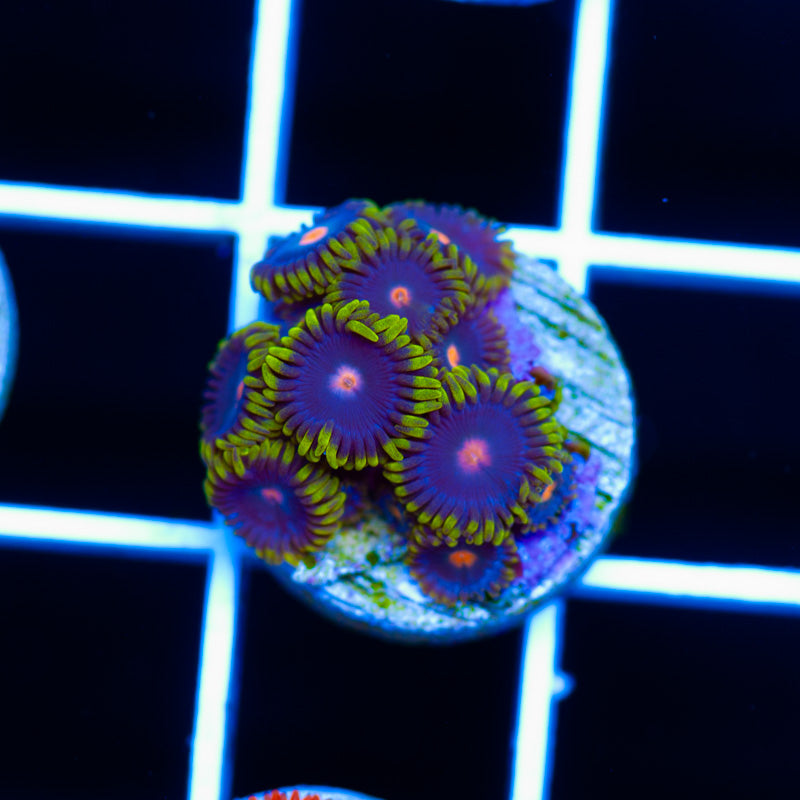 We grow our Zoanthids under ATI Blue Plus, Reef Brite blue LED’s. Nutrition is provided by Polyplab Reef Roids. We achieve the best color and polyp size by providing a system with detectable PO4, NO3, and a DKH of 8(many polyps will respond poorly to high DKH, please take that into consideration). Strong/moderate intermittent flow is very important to the health of our polyps. WYSIWYG