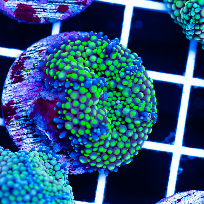 We keep our Ricordea growing under ATI Blue Plus and Reef Brite blue LED’s, nutrition is provided by Polyplab Reef Roids. Ricordea thrive in nutrient rich environments with detectable PO4, NO3, and a DKH of 8(many corals will respond poorly to high DKH, please take that into consideration). WYSIWYG