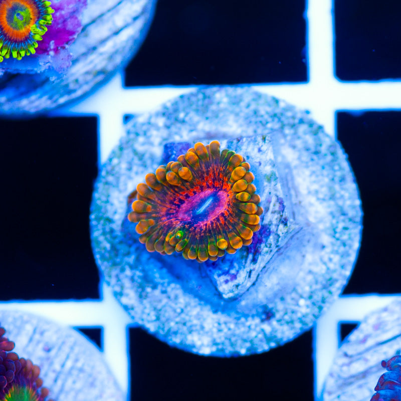 We grow our Zoanthids under ATI Blue Plus, Reef Brite blue LED’s. Nutrition is provided by Polyplab Reef Roids. We achieve the best color and polyp size by providing a system with detectable PO4, NO3, and a DKH of 8(many polyps will respond poorly to high DKH, please take that into consideration). Strong/moderate intermittent flow is very important to the health of our polyps. WYSIWYG