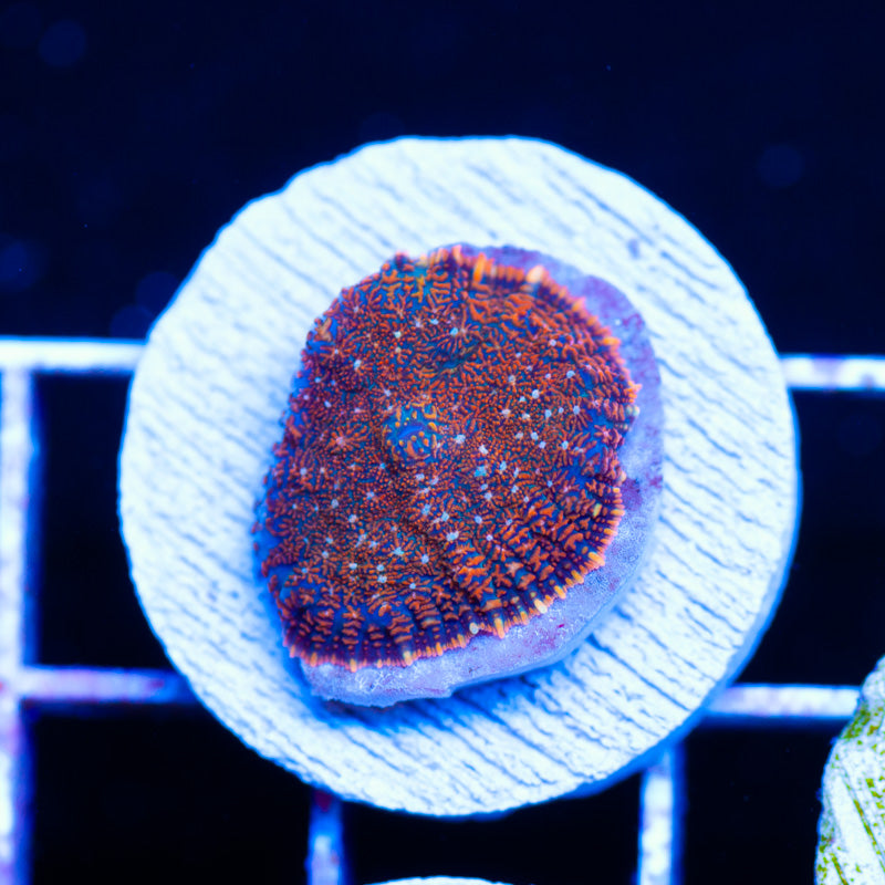 We keep/grow our mushrooms under ATI Blue Plus and Reef Brite blue LED’s, nutrition is provided by Polyplab Reef Roids(although we seldom direct feed) We achieve the best color and polyp size by providing a system with detectable PO4, NO3, and a DKH of 8(many polyps will respond poorly to high DKH, please take that into consideration). low/moderate intermittent flow is very important to the health of our polyps. WYSIWYG