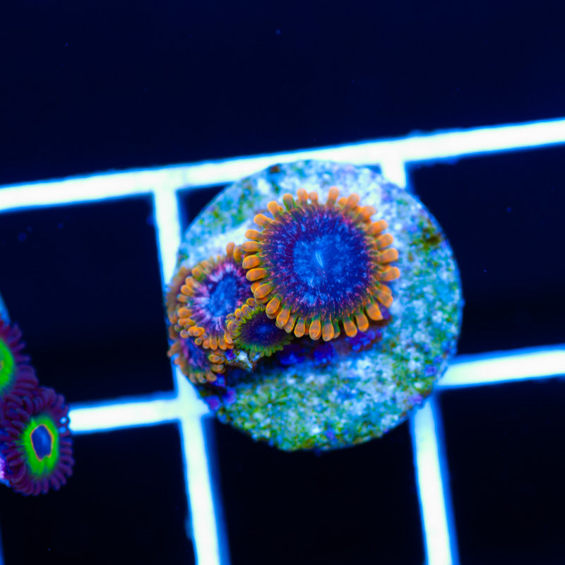 We grow our Zoanthids under ATI Blue Plus, Reef Brite blue LED’s. Nutrition is provided by Polyplab Reef Roids. We achieve the best color and polyp size by providing a system with detectable PO4, NO3, and a DKH of 8(many polyps will respond poorly to high DKH, please take that into consideration). Strong/moderate intermittent flow is very important to the health of our polyps. WYSIWYG