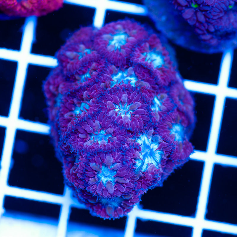 We keep our Blastomussa growing under ATI Blue Plus and Reef Brite blue LED’s, nutrition is provided by Polyplab Reef Roids and/or LRS frozen foods. Blastomussa thrive in nutrient rich environments with detectable PO4, NO3, and a DKH of 8(many corals will respond poorly to high DKH, please take that into consideration). It is our experience that most Blastomussa do best in low light(less than 75 PAR). WYSIWYG