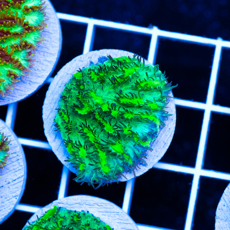 We keep our encrusting corals growing under ATI Blue Plus and Reef Brite blue LED’s in low light, nutrition is provided by Polyplab Reef Roids. Encrusting corals such as cyphastrea and leptoseris thrive in nutrient rich environments with detectable PO4, NO3, and a DKH of 8(many corals will respond poorly to high DKH, please take that into consideration). WYSIWYG