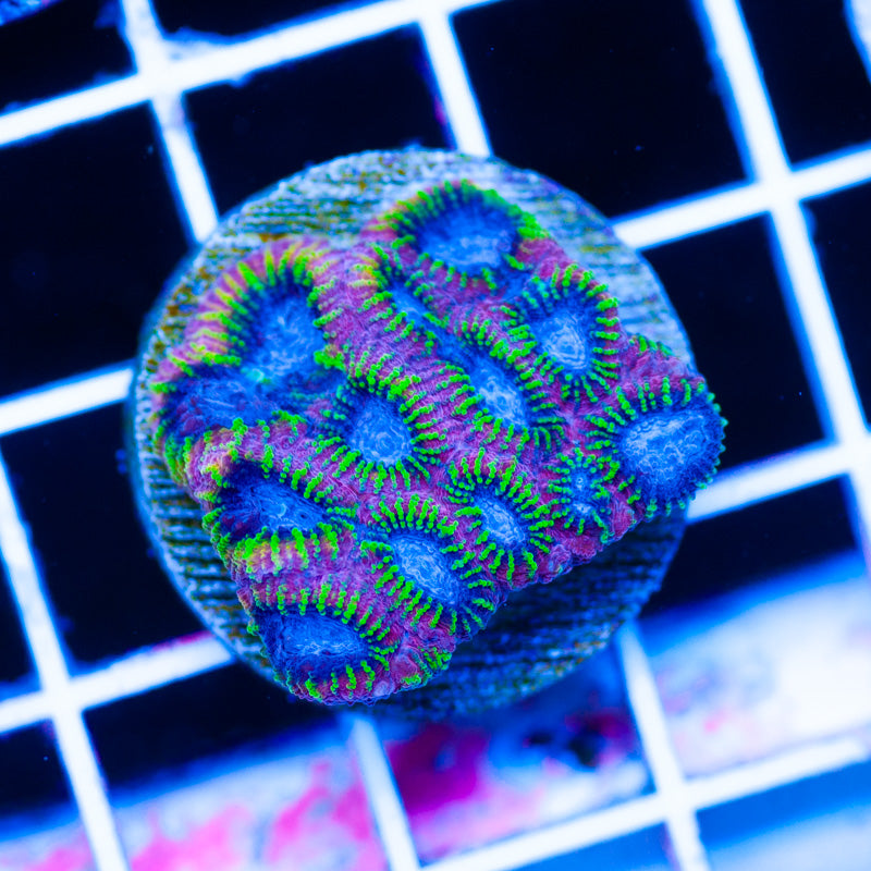 We keep our Favia/Favites growing under Ecotech Radion LED’s, nutrition is provided by Polyplab Reef Roids. Favia/Favites thrive in nutrient rich environments with detectable PO4, NO3, and a DKH of 8(many corals will respond poorly to high DKH, please take that into consideration). It is our experience that most favia/favites do best in low light(less than 75 PAR). WYSIWYG