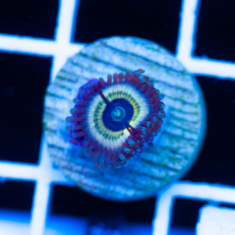 We grow our Zoanthids under ATI Blue Plus, Reef Brite blue LED’s. Nutrition is provided by Polyplab Reef Roids. We achieve the best color and polyp size by providing a system with detectable PO4, NO3, and a DKH of 8(many polyps will respond poorly to high DKH, please take that into consideration). Strong/moderate intermittent flow is very important to the health of our polyps. WYSIWYG