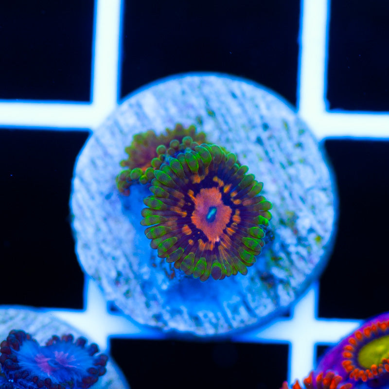 We grow our Zoanthids under ATI Blue Plus, Reef Brite blue LED’s. Nutrition is provided by Polyplab Reef Roids. We achieve the best color and polyp size by providing a system with detectable PO4, NO3, and a DKH of 8(many polyps will respond poorly to high DKH, please take that into consideration). Strong/moderate intermittent flow is very important to the health of our polyps. WYSIWYG