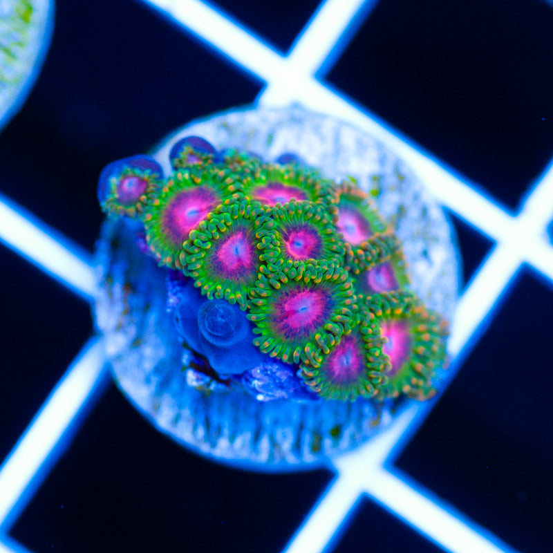 We grow our Zoanthids under ATI Blue Plus, Reef Brite blue LED’s. Nutrition is provided by Polyplab Reef Roids. We achieve the best color and polyp size by providing a system with detectable PO4, NO3, and a DKH of 8(many polyps will respond poorly to high DKH, please take that into consideration). Strong/moderate intermittent flow is very important to the health of our polyps. WYSIWYG