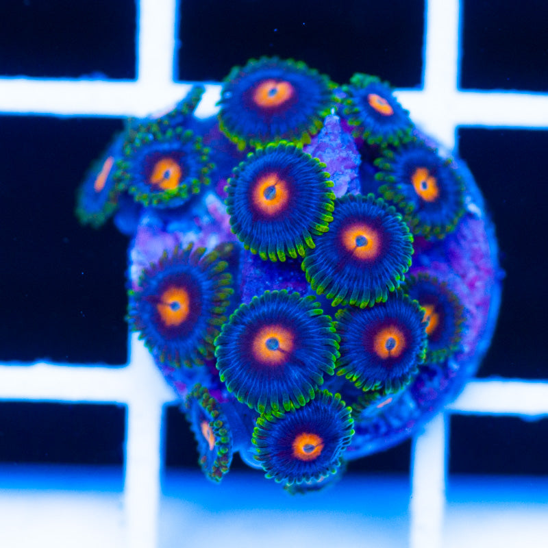 We grow our Zoanthids under ATI Blue Plus, Reef Brite blue LED’s. Nutrition is provided by Polyplab Reef Roids. We achieve the best color and polyp size by providing a system with detectable PO4, NO3, and a DKH of 8(many polyps will respond poorly to high DKH, please take that into consideration). Strong/moderate intermittent flow is very important to the health of our polyps. WYSIWYG