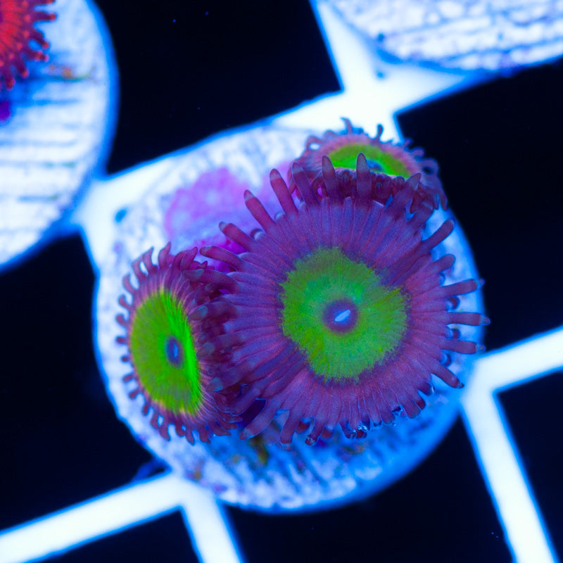We grow our Zoanthids under ATI Blue Plus, Reef Brite blue LED’s. Nutrition is provided by Polyplab Reef Roids. We achieve the best color and polyp size by providing a system with detectable PO4, NO3, and a DKH of 8(many polyps will respond poorly to high DKH, please take that into consideration). Strong/moderate intermittent flow is very important to the health of our polyps. WYSIWYG