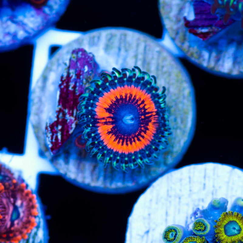 We grow our Zoanthids under ATI Blue Plus, Reef Brite blue LED’s. Nutrition is provided by Polyplab Reef Roids. We achieve the best color and polyp size by providing a system with detectable PO4, NO3, and a DKH of 8(many polyps will respond poorly to high DKH, please take that into consideration). Strong/moderate intermittent flow is very important to the health of our polyps. WYSIWYG
