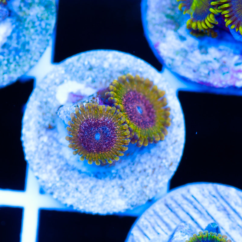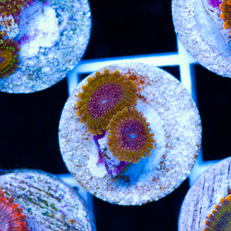 We grow our Zoanthids under ATI Blue Plus, Reef Brite blue LED’s. Nutrition is provided by Polyplab Reef Roids. We achieve the best color and polyp size by providing a system with detectable PO4, NO3, and a DKH of 8(many polyps will respond poorly to high DKH, please take that into consideration). Strong/moderate intermittent flow is very important to the health of our polyps. WYSIWYG