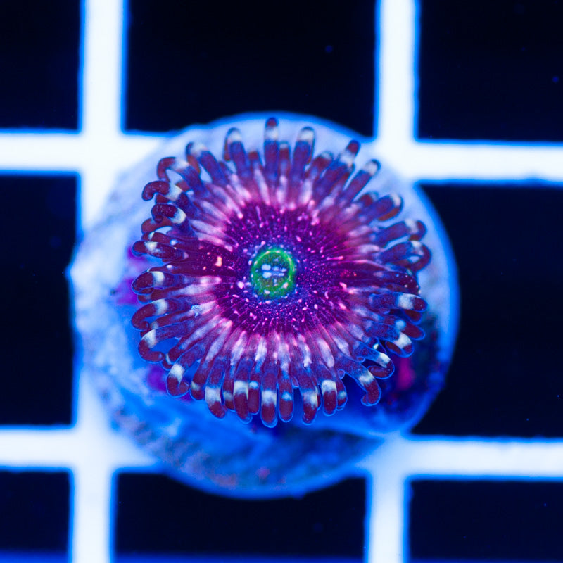 We grow our Zoanthids under ATI Blue Plus, Reef Brite blue LED’s. Nutrition is provided by Polyplab Reef Roids. We achieve the best color and polyp size by providing a system with detectable PO4, NO3, and a DKH of 8(many polyps will respond poorly to high DKH, please take that into consideration). Strong/moderate intermittent flow is very important to the health of our polyps. WYSIWYG