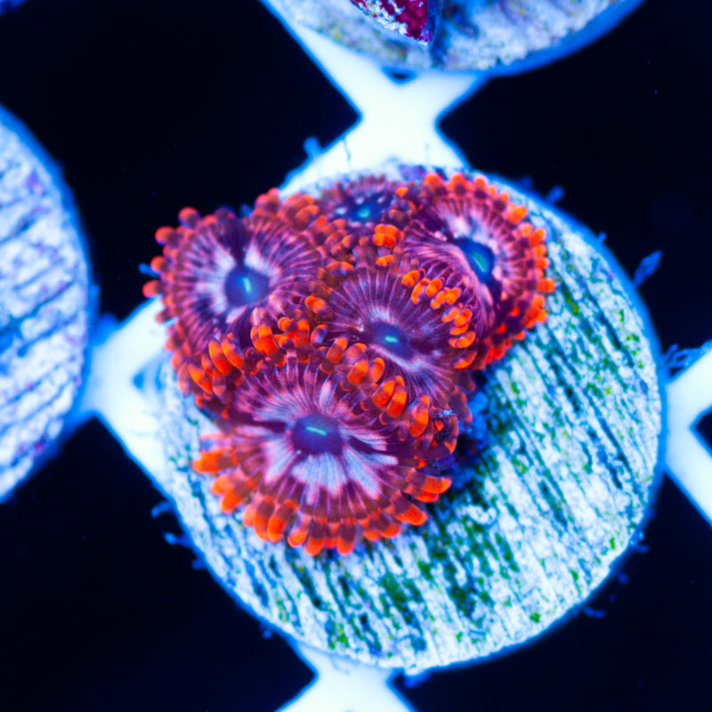 We grow our Zoanthids under ATI Blue Plus, Reef Brite blue LED’s. Nutrition is provided by Polyplab Reef Roids. We achieve the best color and polyp size by providing a system with detectable PO4, NO3, and a DKH of 8(many polyps will respond poorly to high DKH, please take that into consideration). Strong/moderate intermittent flow is very important to the health of our polyps. WYSIWYG