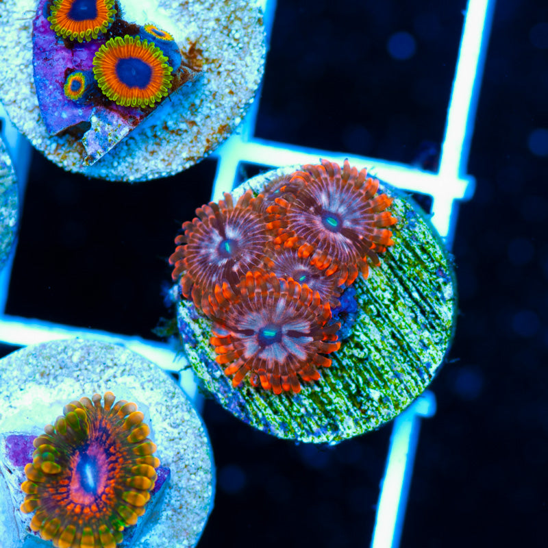 We grow our Zoanthids under ATI Blue Plus, Reef Brite blue LED’s. Nutrition is provided by Polyplab Reef Roids. We achieve the best color and polyp size by providing a system with detectable PO4, NO3, and a DKH of 8(many polyps will respond poorly to high DKH, please take that into consideration). Strong/moderate intermittent flow is very important to the health of our polyps. WYSIWYG
