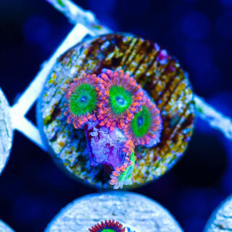 We grow our Zoanthids under ATI Blue Plus, Reef Brite blue LED’s. Nutrition is provided by Polyplab Reef Roids. We achieve the best color and polyp size by providing a system with detectable PO4, NO3, and a DKH of 8(many polyps will respond poorly to high DKH, please take that into consideration). Strong/moderate intermittent flow is very important to the health of our polyps. WYSIWYG
