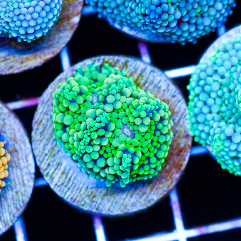 We keep/grow our mushrooms under ATI Blue Plus and Reef Brite blue LED’s, nutrition is provided by Polyplab Reef Roids(although we seldom direct feed) We achieve the best color and polyp size by providing a system with detectable PO4, NO3, and a DKH of 8(many polyps will respond poorly to high DKH, please take that into consideration). low/moderate intermittent flow is very important to the health of our polyps. WYSIWYG