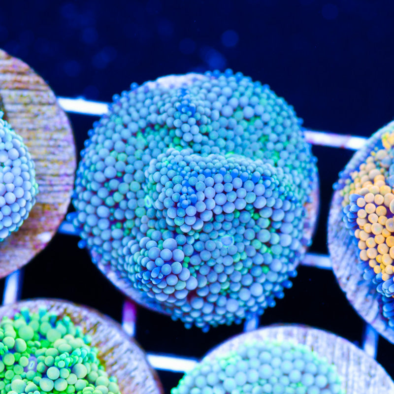 We keep/grow our mushrooms under ATI Blue Plus and Reef Brite blue LED’s, nutrition is provided by Polyplab Reef Roids(although we seldom direct feed) We achieve the best color and polyp size by providing a system with detectable PO4, NO3, and a DKH of 8(many polyps will respond poorly to high DKH, please take that into consideration). low/moderate intermittent flow is very important to the health of our polyps. WYSIWYG