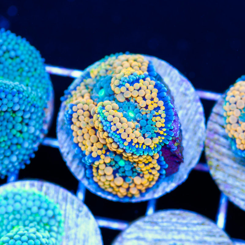 We keep/grow our mushrooms under ATI Blue Plus and Reef Brite blue LED’s, nutrition is provided by Polyplab Reef Roids(although we seldom direct feed) We achieve the best color and polyp size by providing a system with detectable PO4, NO3, and a DKH of 8(many polyps will respond poorly to high DKH, please take that into consideration). low/moderate intermittent flow is very important to the health of our polyps. WYSIWYG