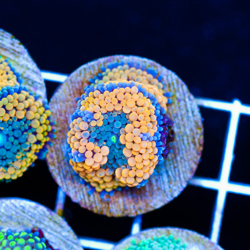 We keep/grow our mushrooms under ATI Blue Plus and Reef Brite blue LED’s, nutrition is provided by Polyplab Reef Roids(although we seldom direct feed) We achieve the best color and polyp size by providing a system with detectable PO4, NO3, and a DKH of 8(many polyps will respond poorly to high DKH, please take that into consideration). low/moderate intermittent flow is very important to the health of our polyps. WYSIWYG