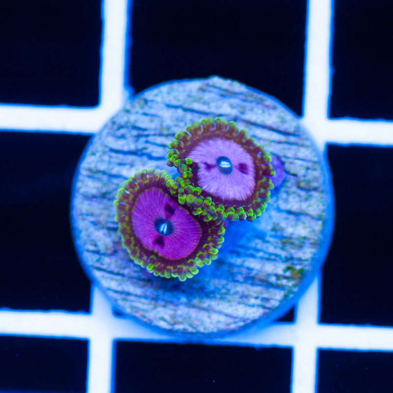 We grow our Zoanthids under ATI Blue Plus, Reef Brite blue LED’s. Nutrition is provided by Polyplab Reef Roids. We achieve the best color and polyp size by providing a system with detectable PO4, NO3, and a DKH of 8(many polyps will respond poorly to high DKH, please take that into consideration). Strong/moderate intermittent flow is very important to the health of our polyps. WYSIWYG
