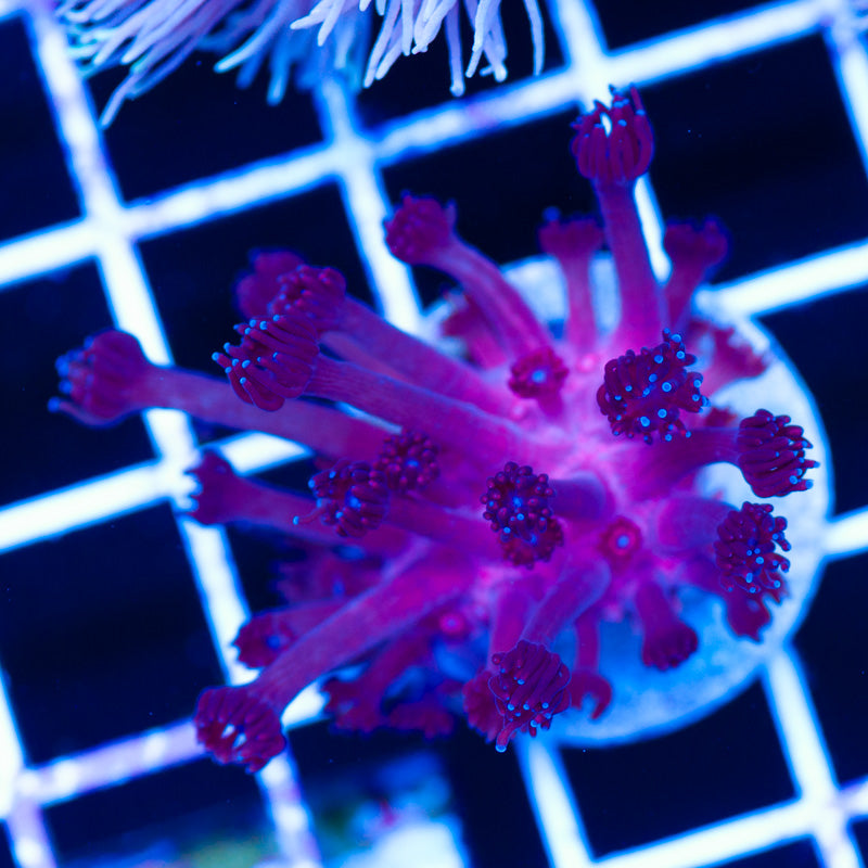 We keep our Goniopora/Alveopora growing under ATI Blue Plus and Reef Brite blue LED’s, nutrition is provided by Polyplab Reef Roids. Goniopora/Alveopora thrive in nutrient rich environments with detectable PO4, NO3, and a DKH of 8(many corals will respond poorly to high DKH, please take that into consideration). WYSIWYG