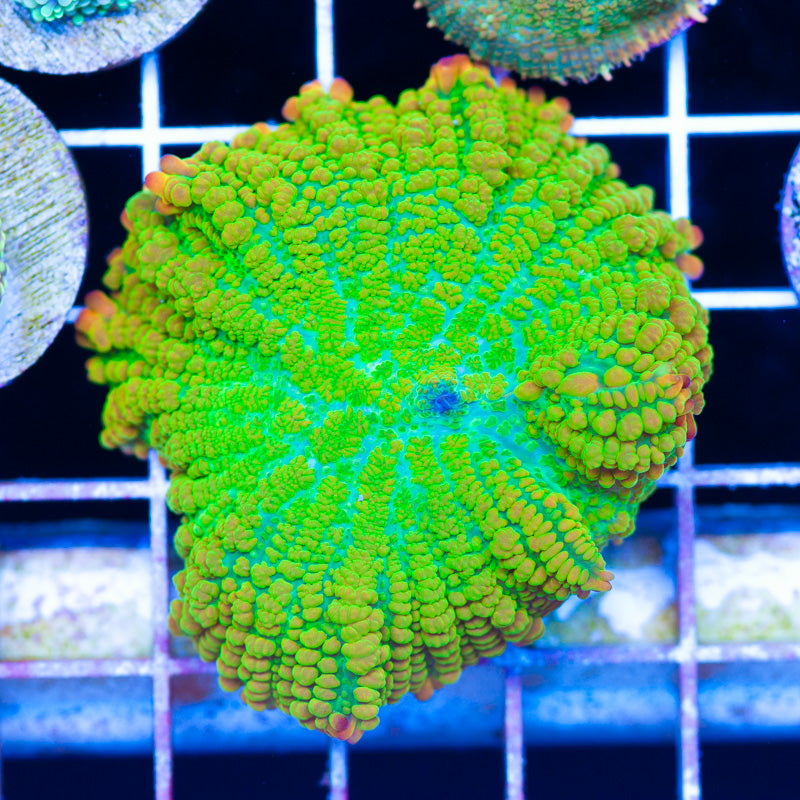 We keep/grow our mushrooms under ATI Blue Plus and Reef Brite blue LED’s, nutrition is provided by Polyplab Reef Roids(although we seldom direct feed) We achieve the best color and polyp size by providing a system with detectable PO4, NO3, and a DKH of 8(many polyps will respond poorly to high DKH, please take that into consideration). low/moderate intermittent flow is very important to the health of our polyps. WYSIWYG